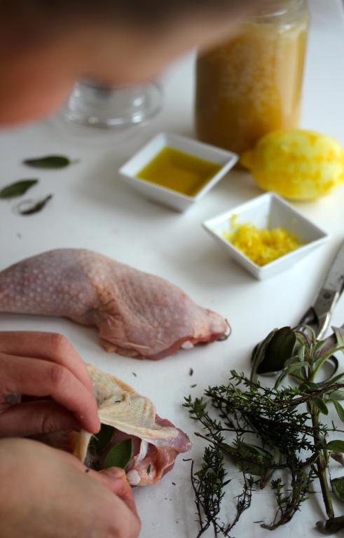 Salbei, Thymian, Zitronenschale, Olivenöl und Fleur de Sel. Dies sind die Zutaten für die Zubereitung meiner Hähnchenschlegel. Zu Beginn wasche ich zunächst die Kräuter und schiebe sie dann mit der Zitronenschale vorsichtig unter die Haut. Auf diese Weise kann das volle Aroma der Kräuter und der Zitrone in das Fleisch ziehen, ohne zu verbrennen.