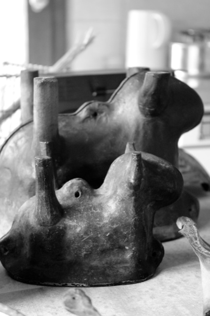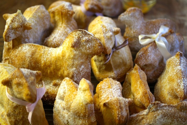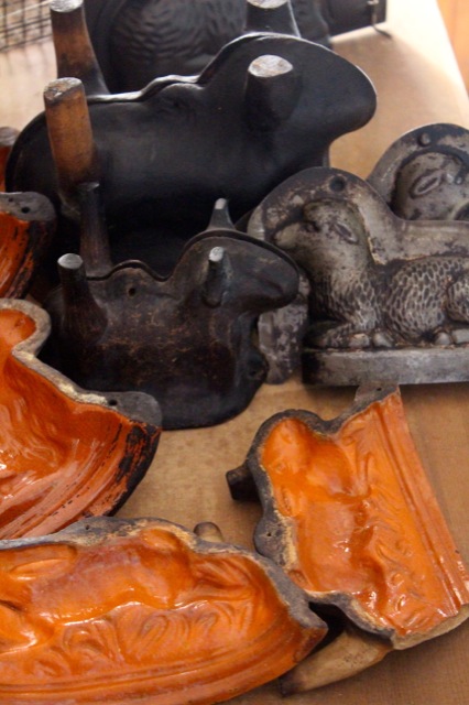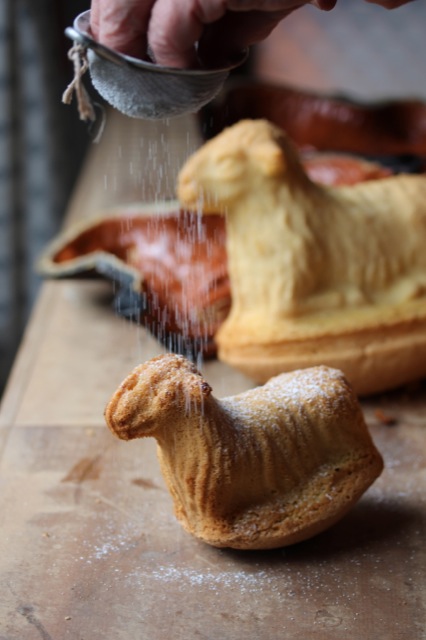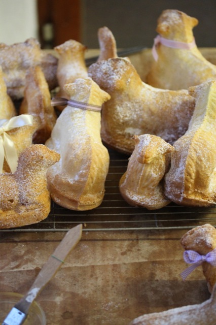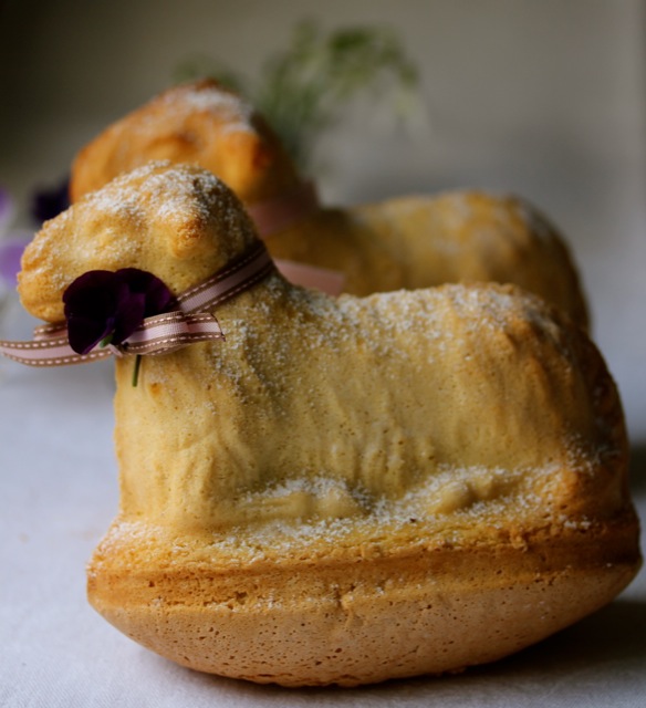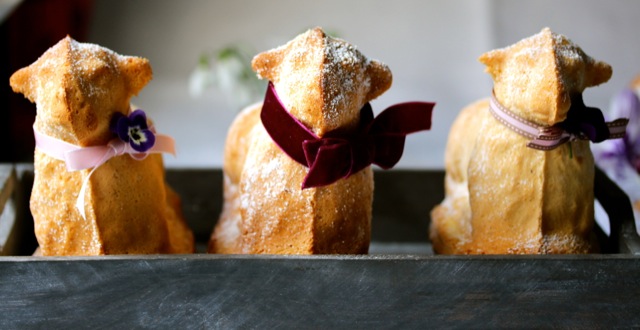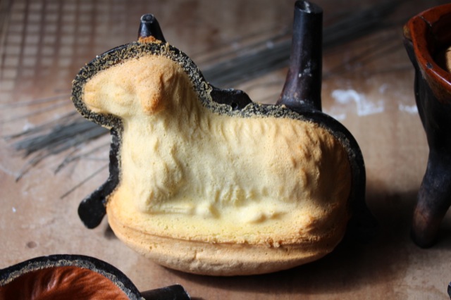 Heute ist es wieder soweit. Die Küche meiner Großeltern verwandelt sich in eine Osterbäckerei! In der Karwoche öffnet meine Großmutter alljährlich wiederkehrend den großen Holzschrank im Keller, in dem die Formen für die Osterlämmer aufbewahrt werden. In einem Flechtkorb trägt sie die über 80 Jahre alten Backformen in die Küche hinauf, wohlwissend wie kostbar sie sind. Die Formen sind zum Teil aus gebranntem elsässischen Ton, zum Teil aus Schwarzblech und werden von Generation zu Generation weitergegeben. Gleichsam wie eine bronzene Glocke wird der Biskuit-Teig für die Lämmer in die Formen gegossen und dann im Ofen gebacken.