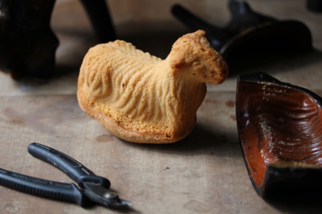 Die Tonformen brauchen im Ofen eine Stunde, die Blechformen eine halbe Stunde. Und dann kommt der besondere, spannende Moment! Das Osterlamm wird aus der Form gelöst. Mein Großvater durchtrennt mit einer Zange den Draht...