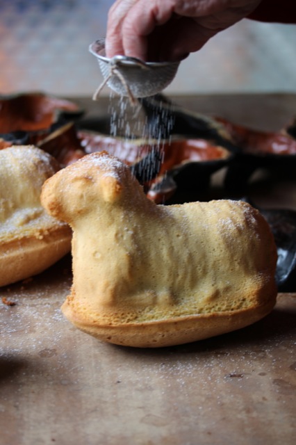 Noch im warmen Zustand werden die Lämmchen mit Puderzucker bestäubt. Sie scheinen es sichtlich zu genießen!