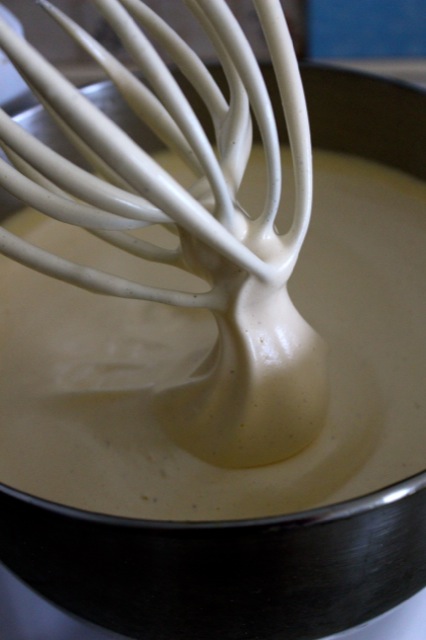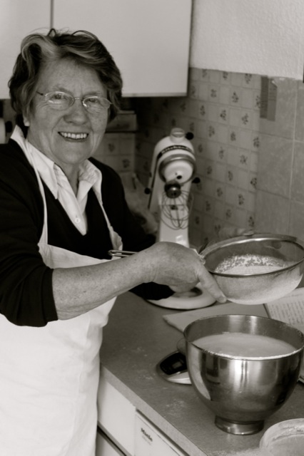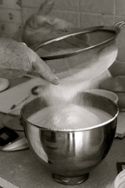 Als erstes wird das Eiweiß vom Eigelb getrennt. Das Eiweiß wird mit dem Wasser und einer Prise Salz in der Küchmaschine aufgeschlagen. Das Geheimnis eines guten Biskuits liegt im langen Schlagen. Wenn das Eiweiß sehr steif ist, den Zucker langsam einrieseln lassen und weiterrühren. Sobald die Masse cremig weiß ist, wird nach und nach das Eigelb hinzugegeben. Nun gilt es die luftige Masse wie eine Prinzessin zu behandeln. Die Kunst liegt darin, das Mehl unter die Masse zu heben, ohne dass sie zusammenfällt. Daher nach und nach das Mehl auf den Teig sieben und vorsichtig mit einem großen Schneebesen unter den Teig heben, nicht rühren! Behutsam fährt meine Großmutter mit dem Schneebesen einmal in den Teig und schüttelt ihn dann in der Luft zurück in die Schüssel. Dieser Vorgang wird solange wiederholt, bis das Mehl vollständig mit dem Teig verbunden ist.